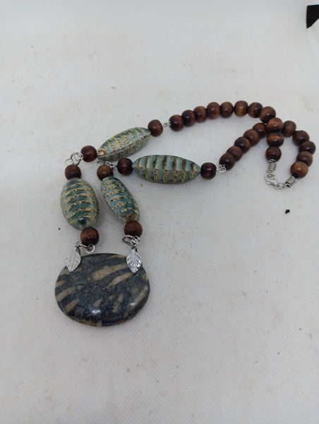 ONE OF A KIND Woman's necklace designed by Dominican artist Aramis Ciriaco Green. This lovely piece has a gorgeous radiolaria pendant. (Petoskey)The necklace's stainless steel wood beads, cucaracha de mar. Length is 18".